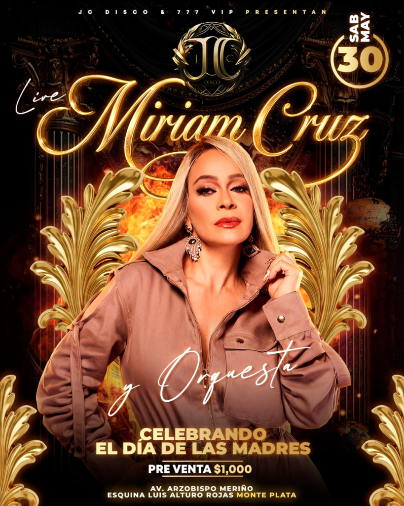 La denominada “diva del merengue”, Miriam Cruz, como parte de la celebración de sus 40 años de trayectoria musical, se presentará este próximo sábado 30 de mayo en la discoteca JC Disco, para llevar lo mejor de su repertorio musical a las madres de Monte Plata.
